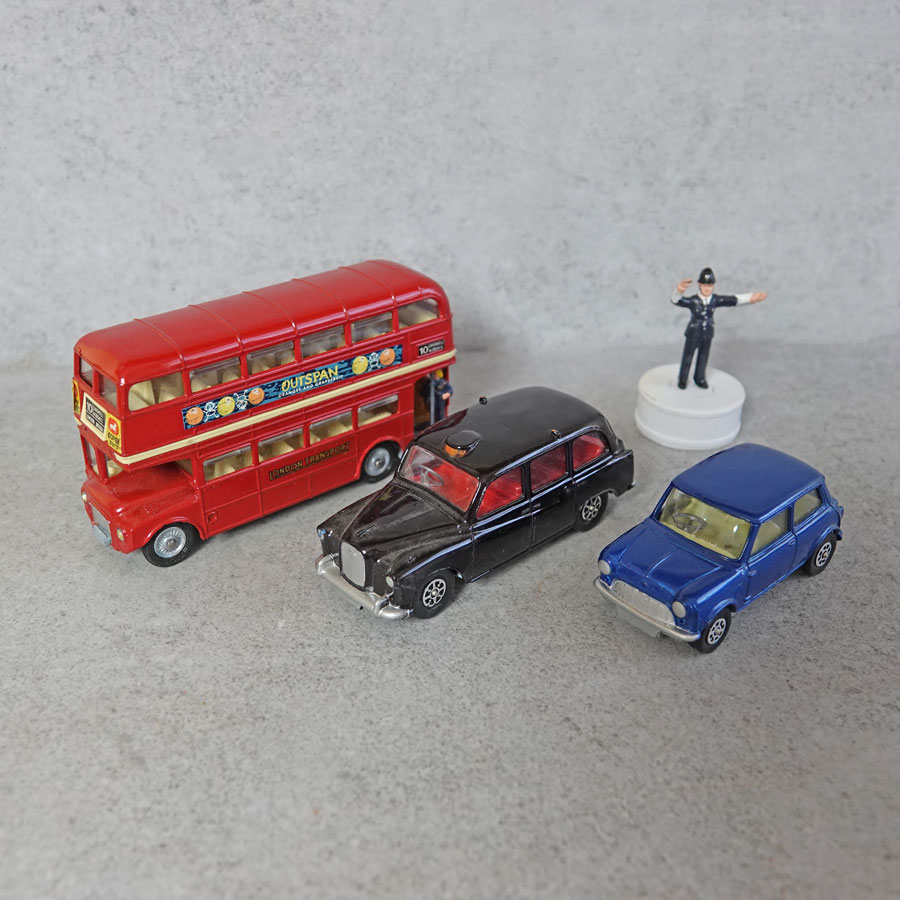 Corgi GS11 Routemaster Bus,Morris Mini Austin Taxi and Police Man